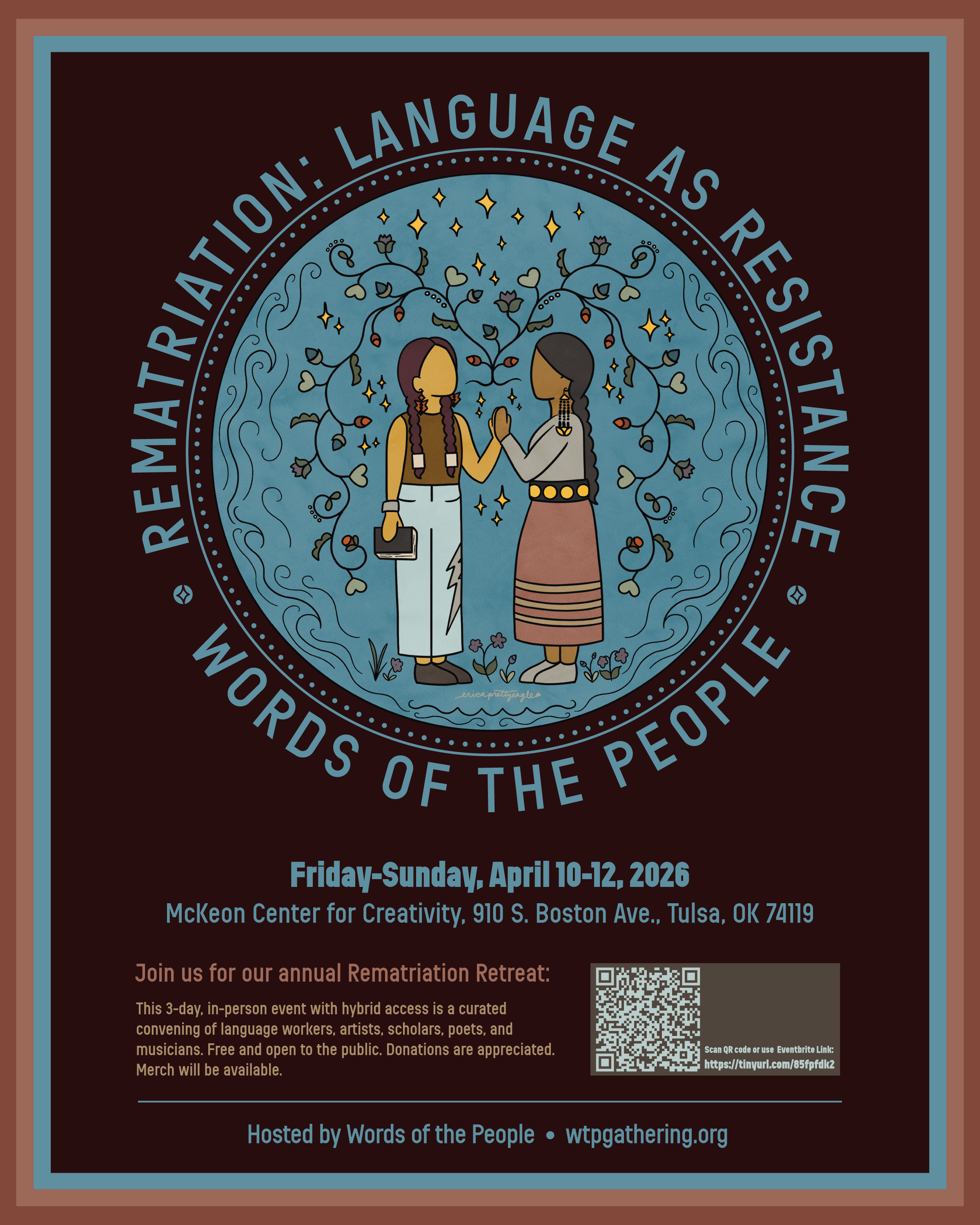 Words of the People welcomes artists, language workers, educators, and community members to its fourth annual Rematriation Retreat, a free, public gathering focused on the theme “Language as Resistance.” Taking place April 10–12, 2026 at the TCC Mckeon Center for Creativity in downtown Tulsa, the retreat explores how language, art, and cultural practice intersect.